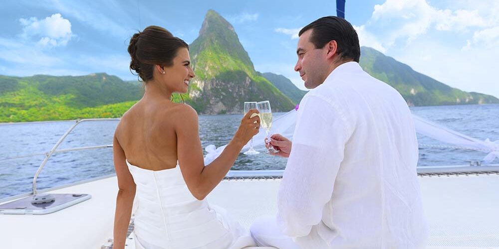 Our Sapphire wedding package includes all the essential elements for an intimate luxury wedding experience for up to six guests, including the bride and groom. You’ll enjoy exchanging your vows aboard a private catamaran cruise with the majestic Pitons in the background. A single tier wedding cake and champagne toast served by a personal butler offer all the amenities you’ll need for your once in a lifetime.